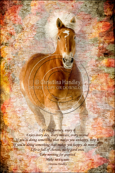 This is my Belgian mare Reba who I lost to Cancer on July 13, 2009 exactly one year earlier to the day that I received my Cancer diagnosis. Reba lived her entire life on our family farm and she was always full of life with lots of attitude. She graced the covers of numerous magazines and catalogs so it is only fitting that she grace the cover of this card. Thank you for your support! Please view my Relay For Life page here: http://convio.cancer.ca/goto/ChristinaHandley One set of 4 cards Two sets of 4 cards For larger quantities, please email me at christina@christinahandley.com.